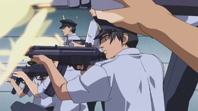 Chapter 82 - Automatic and semi-automatic weapons used by soldiers under the command of Nousou and the Agent as they begin the invasion of Maple House; weapons could be H & K MP5's.