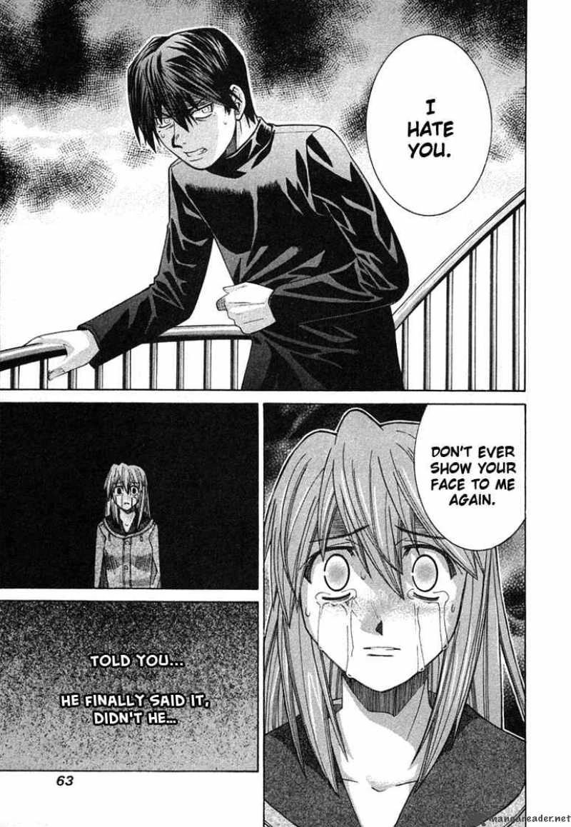 Meanwhile, at the lighthouse, Kouta walks down the stairs just in time to see Lucy standing over a rapidly bleeding Kurama, who had his left arm severed right at the shoulder. Emotionally and physically drained, he rushes to judgment and ignores her tearful pleas that she is not responsible and assumes that she has broken her promise. Kouta also remarks with bitterness that they cannot live together at all since she is an uncontrollable murderer and can never be trusted. In confirmation of both her worst fears and her inner voice's taunts, he angrily states that he hates her and wishes never to see her again.