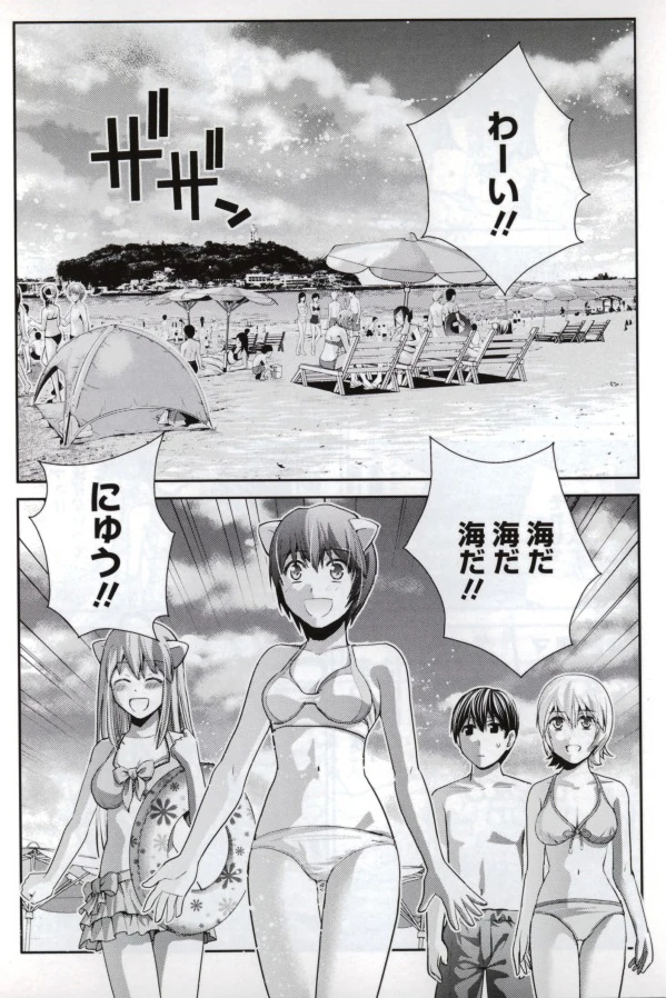 The story is markedly different from much of the series, and the location detail as well as the order of the day are said to be more in keeping with stories the mangaka had wanted to tell with the characters. This alternate beach may even have some manner of mystic properties : Both Nana and Nyu go about having fun without any sort of headwear to hide their horns, even with perennial nemesis Bando cleaning up litter and harassing litterbugs right nearby.