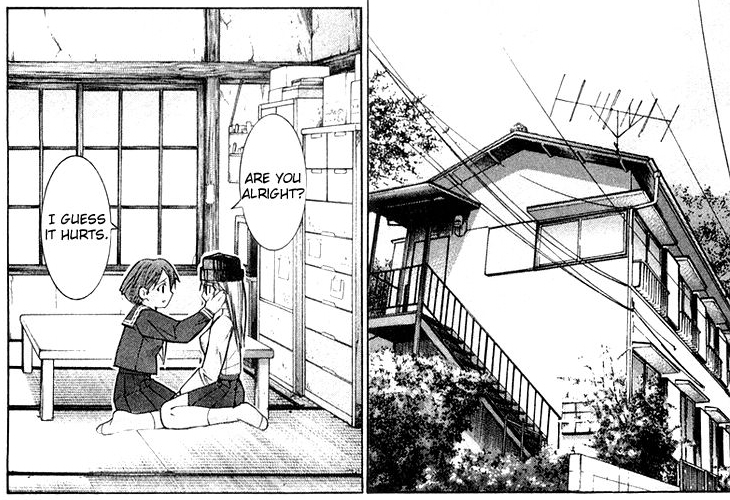 The apartment where Aiko Takada and her father lived was in Kamakura, but it's exact location is never given. It was situated near a park where Aiko would often see an adolescent Lucy sitting by herself. The apartment was small, as they tend to be not only in urban environments but especially in Japan's closely-packed cities. Judging by the cramped space and the cracks in some parts of the walls, Aiko's father most likely left the cleaning to Aiko despite her having to work to pay some of the rent. The apartment's small size contributed greatly to the altercation between Aiko and her father in Chapter 85. Mr. Takada's earlier encounter with Lucy dislodged the painting Aiko was hiding in the attic, and he was so furious at the sight of the painting that he tried to cut it up, only to slice his own neck open as Aiko pushed him and threw off his aim.