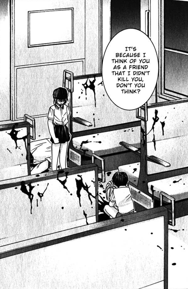 Lucy bid her time well. Rather than attack at the station as Kouta, his father, and Kanae said goodbye to Yuka and her mother for what they assumed was only another year, she waited and watched. Rather than kill Yuka and her mother after Kouta and his family boarded the train, Lucy snuck onboard the train herself and waited in the next cabin. Only after Kanae's fight with her brother did she finally make her presence known, and while Kouta was happily surprised to see her, Kanae feared for their lives from the moment she saw her. Her pleas for her brother to run away fell on deaf ears, as Kouta refused to believe his friend could be responsible for the deaths at the festival. As Kouta told his sister he hated her for lying to him; Lucy killed the girl by cutting her in half at the waist. As Kouta screamed and his father cradled the brutally maimed corpse of his child, Lucy merely laughed, saying Kouta was the stupid one and not his sister. When his father turned his attention toward her, perhaps meaning to scream at her, she killed him instantly by beheading him. In shock, Kouta asked her why she would do this to him. After all, weren't they friends? The girl's answer was that they were friends, and their friendship was the only reason Kouta still lived. As Lucy walked past him, she stated Yuka would be her next prey, prompting Kouta to tackle her, shake her, and beg her to stop. As he pleaded with her to cease her bloodshed, Lucy wondered how it came to this. She knew that all she'd wanted was Kouta's affection, yet she'd caused him so much heartbreak. She tore a hole in the roof of the train to escape, leaving Kouta alone with the corpses of his family.