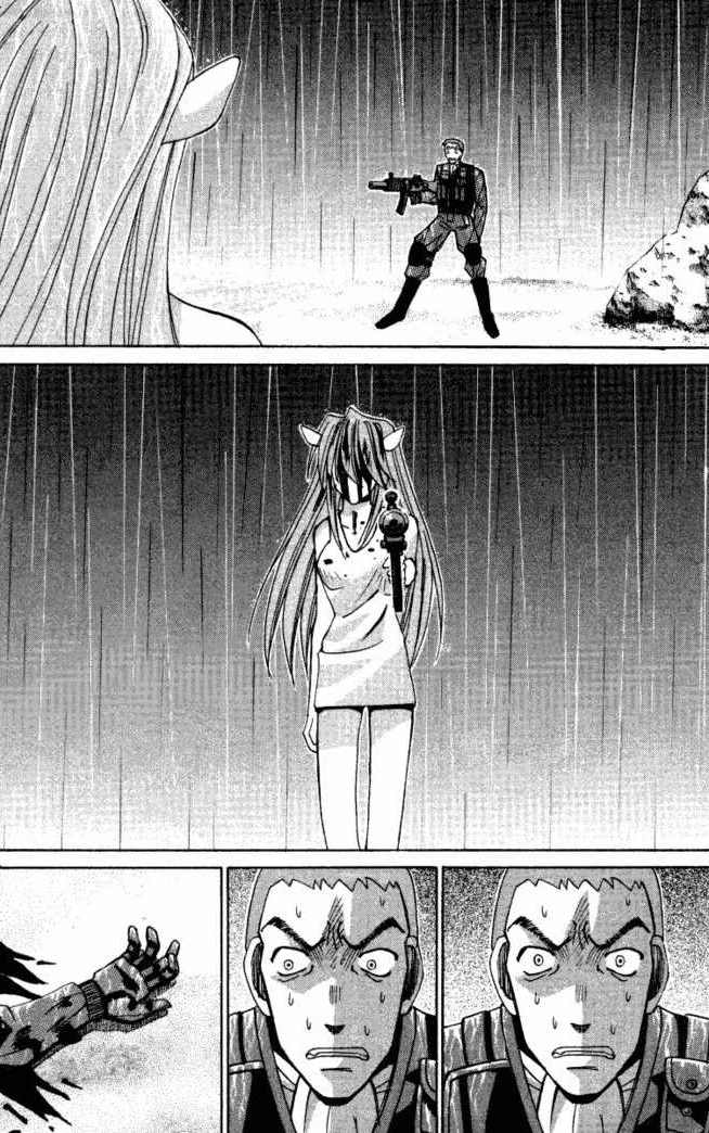 Ordered and egged on by Bando, Satou apologizes to the unconscious Nyu as he prepares to shoot her. Bando, back turned while lighting a cigarette, hears the gunfire followed by the sounds of bones cracking and blood spattering. Satisfied, he prepares to call the kill in, only to turn around and see that Satou has a hole blown right through his midsection. Immediately after, something severs his left arm, and as he screams and Bando puzzles at the scene, he is savagely decapitated by an unseen force as the horned girl laughs maniacally. Bando is unaware, but his brutalizing Nyu has only woken Lucy up.