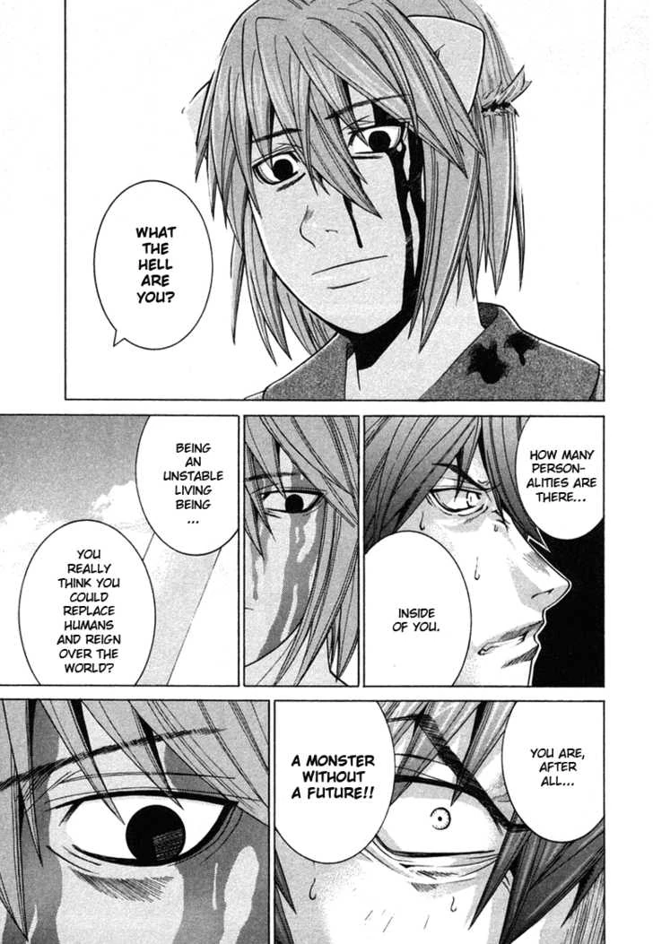 What appears to be Lucy is shown with Kurama lying in front of her with his left arm severed at the shoulder, and herself covered in both her blood and his own. A narrative of the DNA-driven inner voice, which, for the first time actively possessed her body, chastises her other self for almost allowing their physical form to die. Kurama verbally assaults her for being unstable, with even more personalities than they thought, and wonders how such a person ever thought she would replace humans. The inner voice retaliates that homo sapiens are equally unstable, just before its first-ever bout of real control abruptly ends. Lucy wakes up in horror to the bloody carnage, with Kouta walking right up and witnessing not her inner struggle, but only the clear sight of her apparently broken promise.